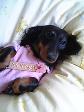 お昼寝中のここあにちょいと持たせて、わんショットしましたので写真添付します。見てくださ〜い。ブラックタンといえどもほぼまっくろなここあには、女の子をアピールするには、やっぱりピンクとレッドでした〜。着ているフリースも福袋に入っていたものですよ。気に入ってます☆