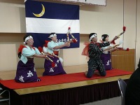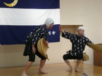 懇談の途中「正調安来節保存会関西支部高槻支部」のメンバーによるアトラクション第二部の安来節(ドジョウすくい)が始まる。安来節の歌に合わせて会場から手拍子が鳴り始めた。この会には幹事の古澤氏が所属していて、彼もドジョウすくいを披露してくれた。