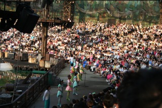 みんなそろって「校歌」を歌おう~~~という呼びかけで人気アトラクション「ウォーターワールド」を貸切り、記念式典が行われた。会場には3,000名しか入れないので2回に分けて開催された。それでも入場確約券を持っていない人は入れなかった。折角来たのに残念という人がかなりおりました。