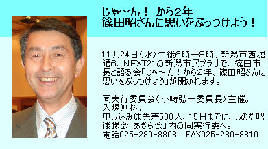 「新潟に青空を呼ぼう」と、合併・政令市づくり、市政改革をスローガンに掲げ、同市で43年ぶりの民間出身の市長となった篠田さんは「青空市長」として多くの市民の期待を集めてきました。